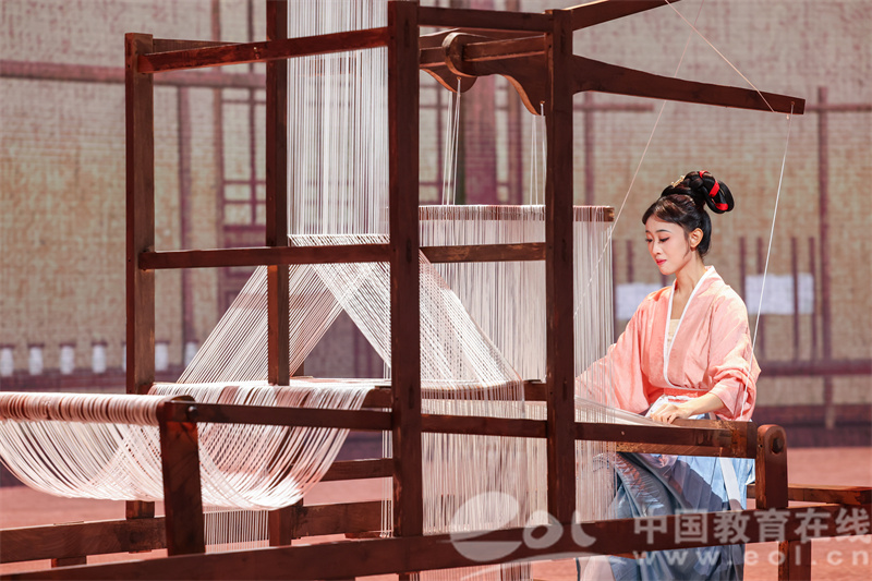 作品《织·梦》改编自浙音原创舞蹈《白纻舞·在水一方》,展示了中国传统的“女织”风俗,颇具江南审美意象。舞台上,青年教师李秋竹及喻佳颖、周莹、林可欣等15位同学将传统纺织技艺融入舞蹈动作,以纺织女工的梦境作为载体,通过舞蹈与现代科技交融的形式,将织女的巧艺与对美满生活的向往呈现在诗情画意的山水意境之中,将南宋古画《蚕织图》缓缓展开,为观众带来一场古今相通,美轮美奂的艺术体验。