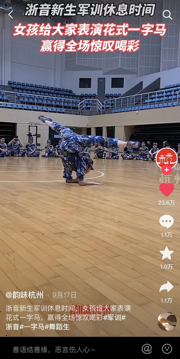 韵味杭州:浙音新生军训休息时间 女孩给大家表演花式一字马 赢得全场惊叹喝彩
