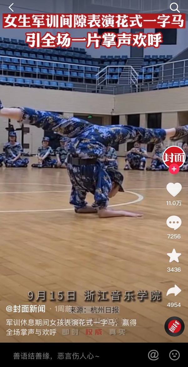 封面新闻:军训休息期间女孩表演花式一字马,赢得全场掌声与欢呼