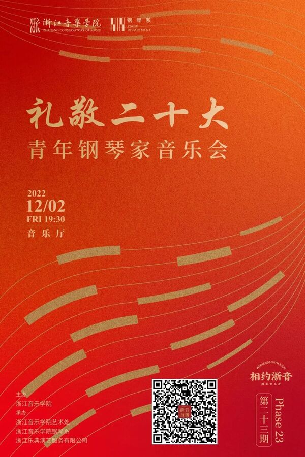 活动简介:本期“相约浙音”周末音乐会,将由浙音钢琴系推出“礼敬二十大——青年钢琴家音乐会”专场晚会。这是浙音用钢琴向党的二十大礼敬、向中华民族生生不息的生命力致敬的一次重要尝试。本场音乐会涵盖中外著名钢琴作品。开场曲目选用中国经典钢琴作品《平湖秋月》,展现了杭州西湖十景之一的秀丽景色,表达了“一色湖光万顷秋”的绝美景色,凸显了浙江特色;而多首经典的外国作品则展示出浙音钢琴系青年钢琴家出色的专业技能。