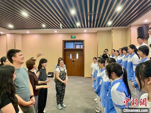 6月14日,在浙江省杭州第十四中学康桥校区,美国青年代表与该校合唱团师生交流。张斌摄