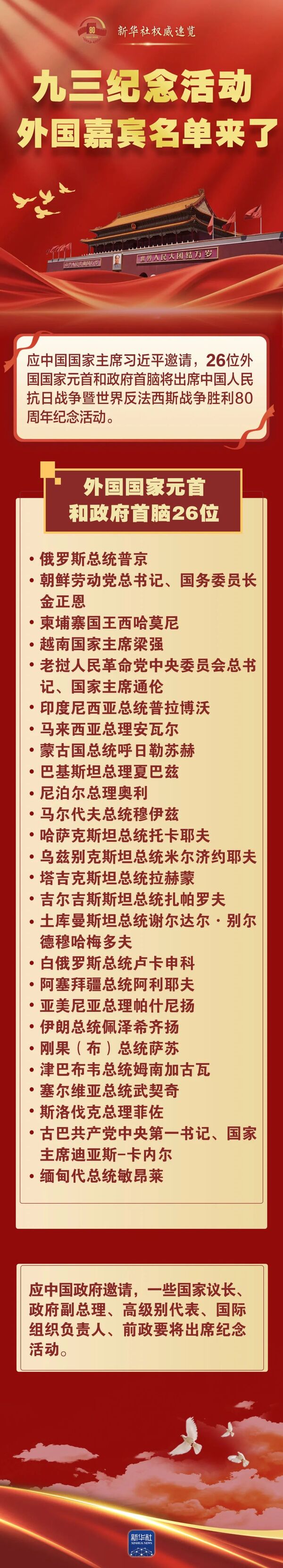 应中国国家主席习近平邀请,26位外国国家元首和政府首脑将出席中国人民抗日战争暨世界反法西斯战争胜利80周年纪念活动。他们是: