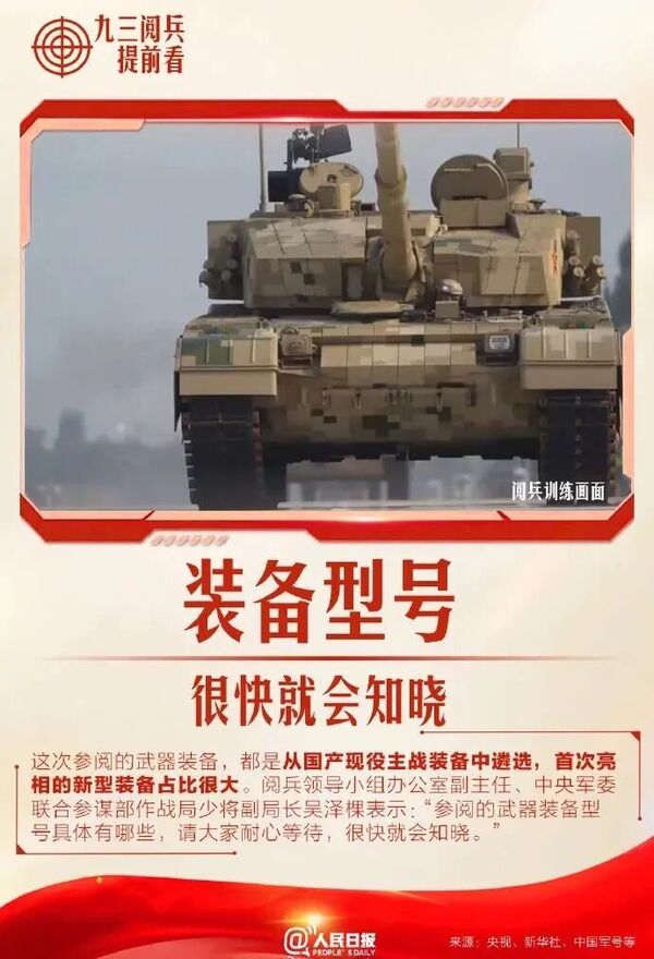 阅兵领导小组办公室副主任、中央军委联合参谋部作战局少将副局长吴泽棵说,这次阅兵是中国人民抗日战争暨世界反法西斯战争胜利80周年纪念活动重要组成部分,参阅力量要素全,结构编成体系化,武器装备数量多,初次亮相占比高,是进入新时代新征程人民军队政治建军新风貌、力量结构新布局、现代化建设新进展、备战打仗新成效的一次集中展示。目前,已在天安门地区完成了三次综合演练,总体达到预期效果,全体受阅部队精神饱满、士气高昂,所有参阅武器装备始终保持良好状态,阅兵准备基本就绪,已经进入倒计时。