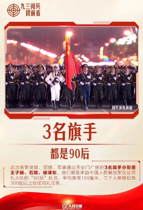9月3日,天安门广场将举行盛大阅兵。礼炮环节盲取盲送、3名旗手都是90后、“钢铁洪流”配战旗方队……9个细节,提前解码!