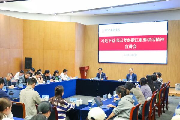 10月20日下午,学院党委书记干武东在行政楼103会议室为师生宣讲习近平总书记考察浙江重要讲话精神。党委副书记王均寅主持宣讲会。