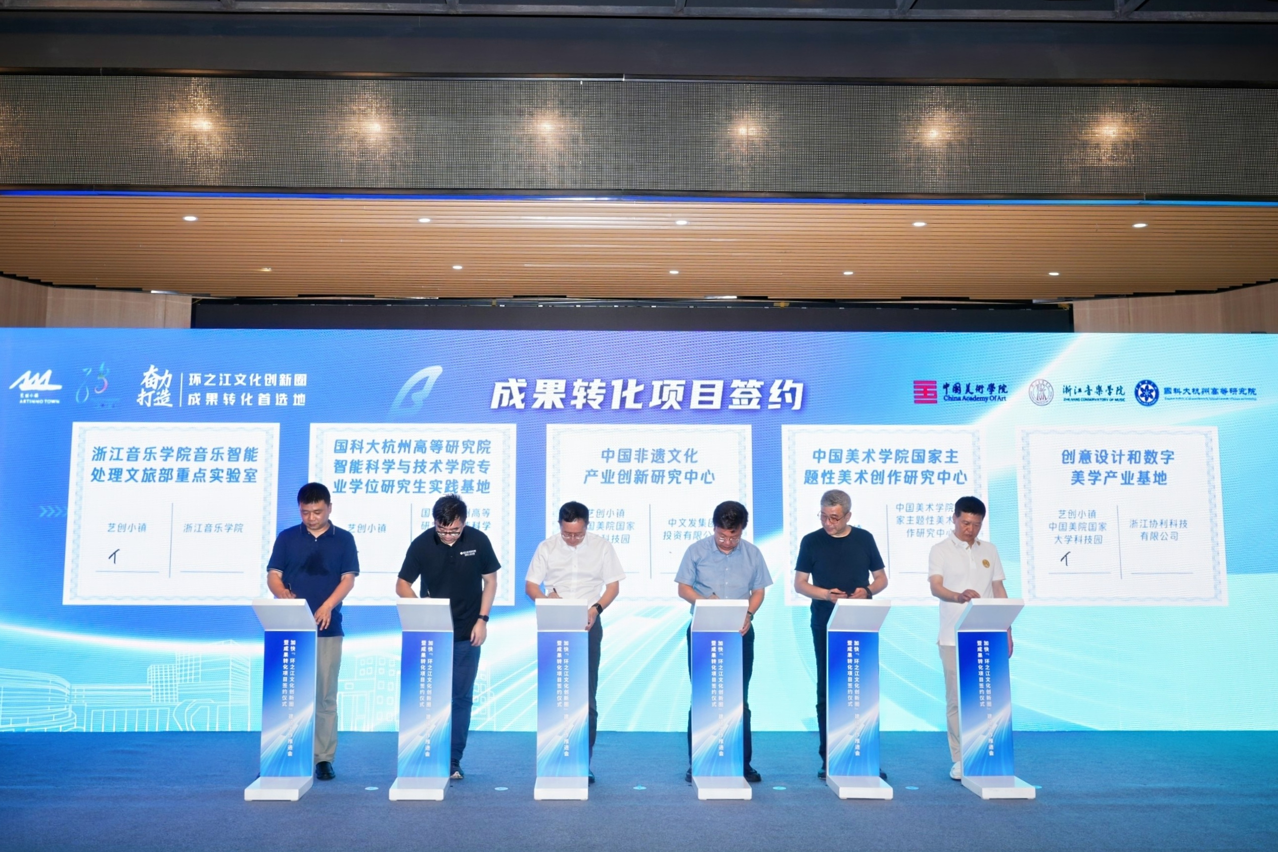 数字音乐智能处理技术文化和旅游部重点实验室与中国美术学院中国非遗文化产业研创中心、创意设计和数字美学研创基地、国家重大题材美术研创中心、无垠之境艺术社群、BAC艺术社区、大岭艺术街区、外桐坞艺谷等9个校地合作项目分别与艺创小镇、转塘街道签署成果转化项目合作备忘录。