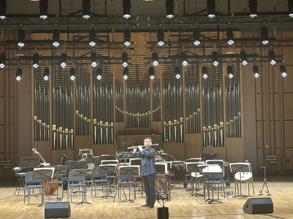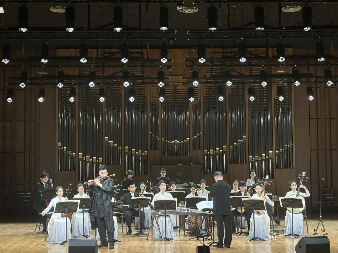 赵琦再度登台,独奏俞逊发的遗作《琅琊神韵》,击音与哨笛双音等技法的运用,将琅琊山的玄妙之境展现得淋漓尽致。终曲《幽兰逢春》由乐团全体奏响,作品以昆曲音乐为创作素材,在保留传统戏曲韵味的同时,通过现代编配手法赋予其新的艺术生命。这首充满诗意的终曲,为整场音乐会画上了意蕴深远的句点。