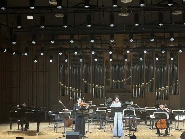 陈欣若创作的《探个够》以创新的四重奏编制打破传统民乐边界,由张正、张晶洁、张正宸及迟梦林4位演奏家共同呈现,作品以探戈的强烈韵律与即兴风格为基底,竹笛的灵动与大提琴的浑厚形成鲜明对比,小提琴的抒情线条与钢琴的复杂节奏相互映衬,既保持民族传统乐韵,又融入现代音乐的创作思维,展现了民族音乐在当代语境下的无限可能。