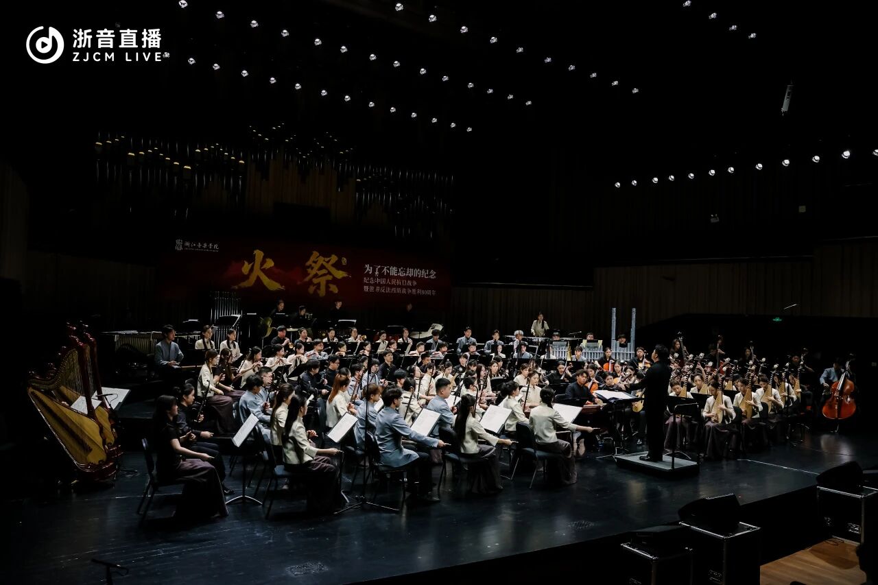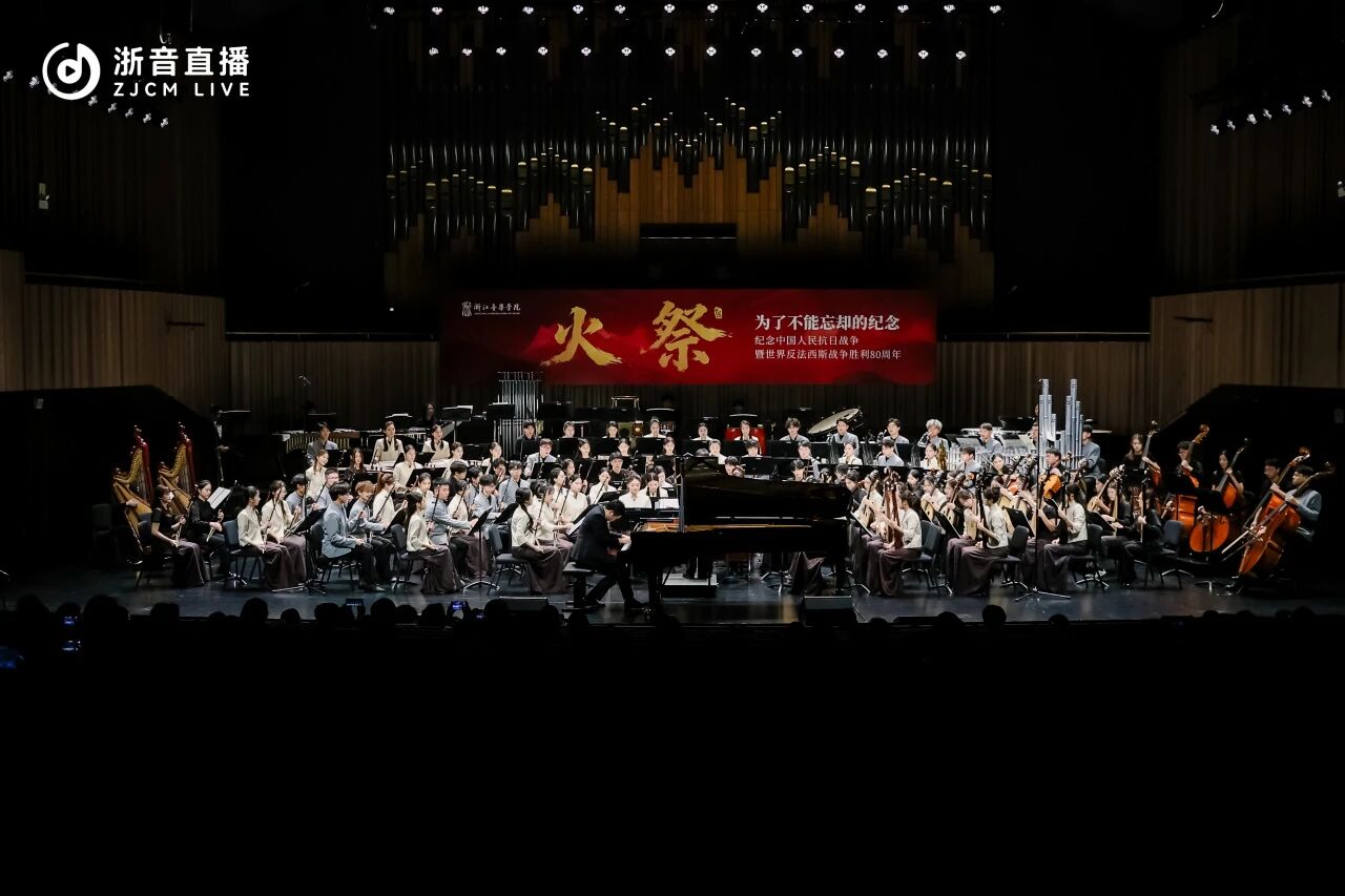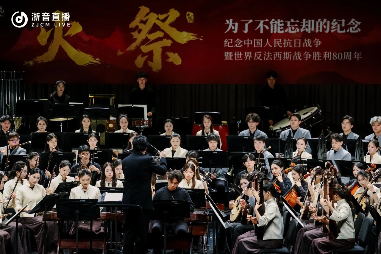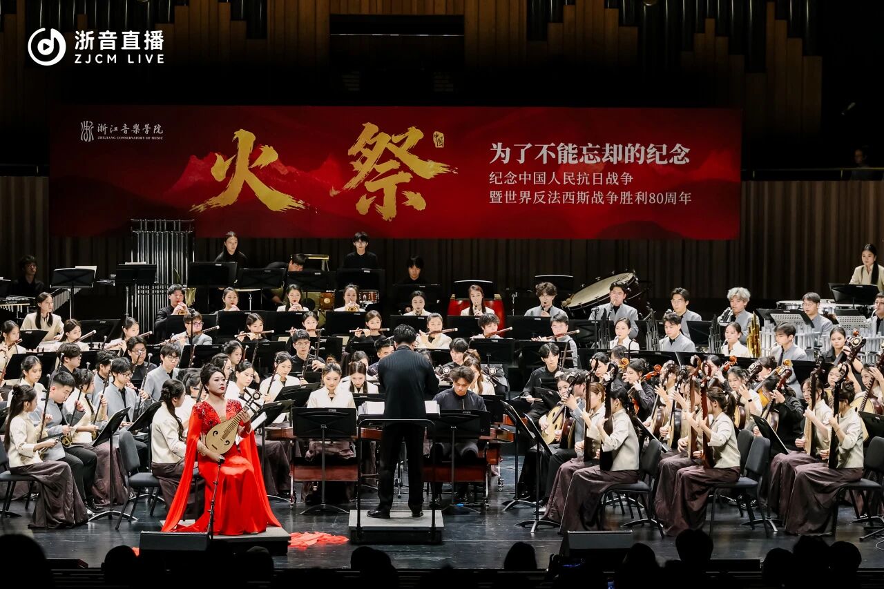 9月28日晚,浙音音乐厅内暖黄色的灯光与红色主题背景交相辉映,浙音民族室内乐团《火祭——为了不能忘却的的纪念》专场音乐会在此上演。作为乐团2025下半年乐季的开篇之作,这场以纪念中国人民抗日战争暨世界反法西斯战争胜利80周年为主题的音乐会,通过震撼人心的民族器乐演绎,完成了一次跨越时空的历史对话与精神传承。