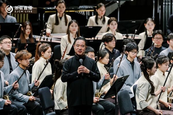 谭盾创作的拉弦乐器协奏曲《火祭》堪称整场演出的灵魂。曲目由乐团艺术总监王甫建执棒,国乐系青年教师薛辰茜与乐团青年二胡演奏家裴文钰先后以中胡、二胡、高胡三种音色构筑出当代音乐的舞台祭祀,意韵深刻、悠长,在民族管弦乐队的烘托下层层递进,再配合浙音附属音乐学校合唱团的童声合唱,将对民族悲剧的追思、对战争亡灵的祭奠与对和平的期盼熔于一炉。尤其当 “祭祀、自然、民俗” 三大音乐“色彩块”在舞台上交织叠置,时而松散自由,时而集中有力,现场观众无不被这份穿透时空的艺术感染力所震撼。