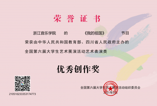 5月12日,以“奋斗·创新·奉献”为主题的全国第六届大学生艺术展演活动在四川成都落下帷幕。由学院艺术处统筹选送的国乐系节目民族管弦乐合奏《我的祖国》和舞蹈系节目当代舞《彷徨》获得全国第六届大学生艺术展演一等奖及优秀创作奖,学院获优秀组织奖。