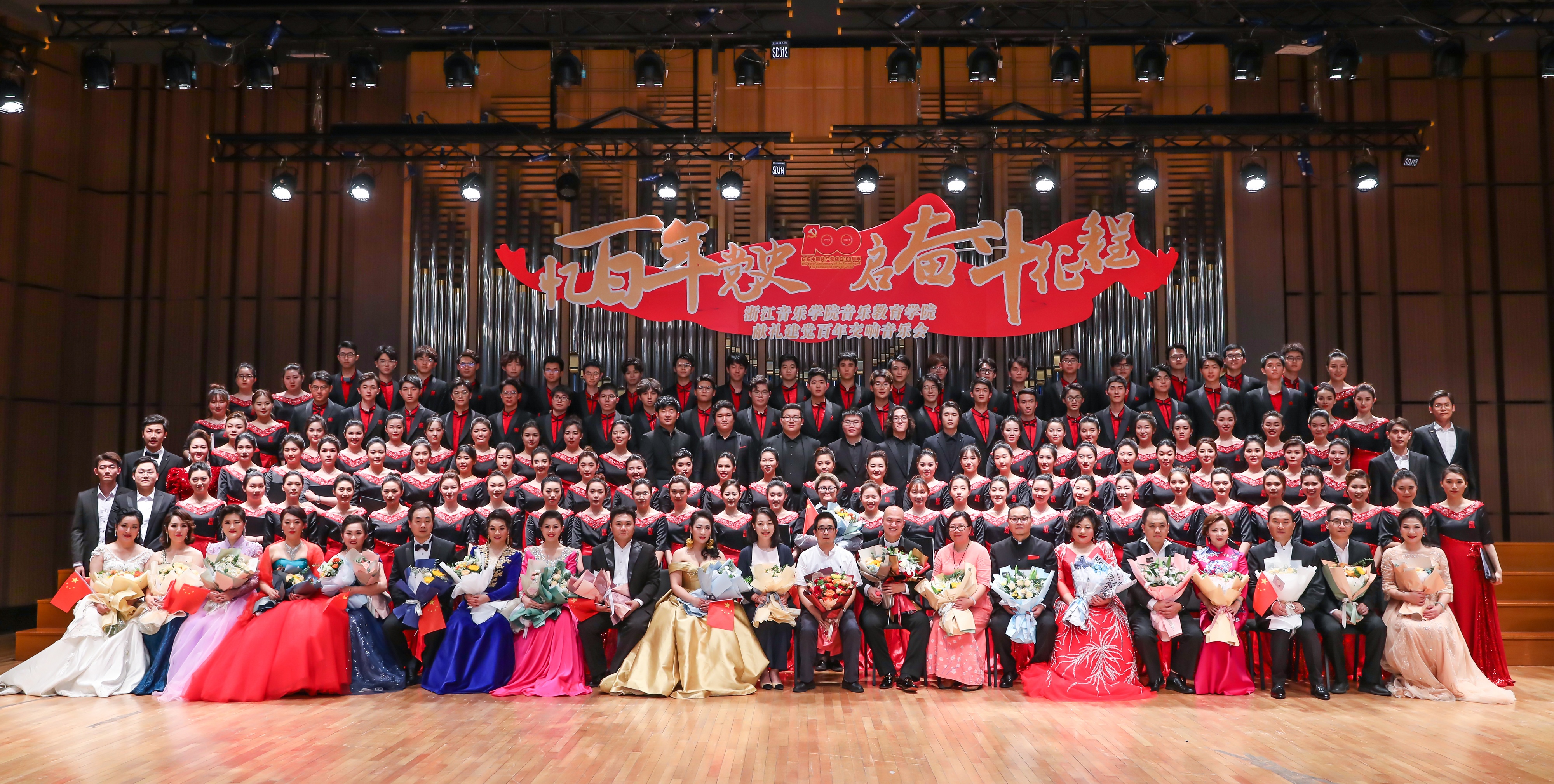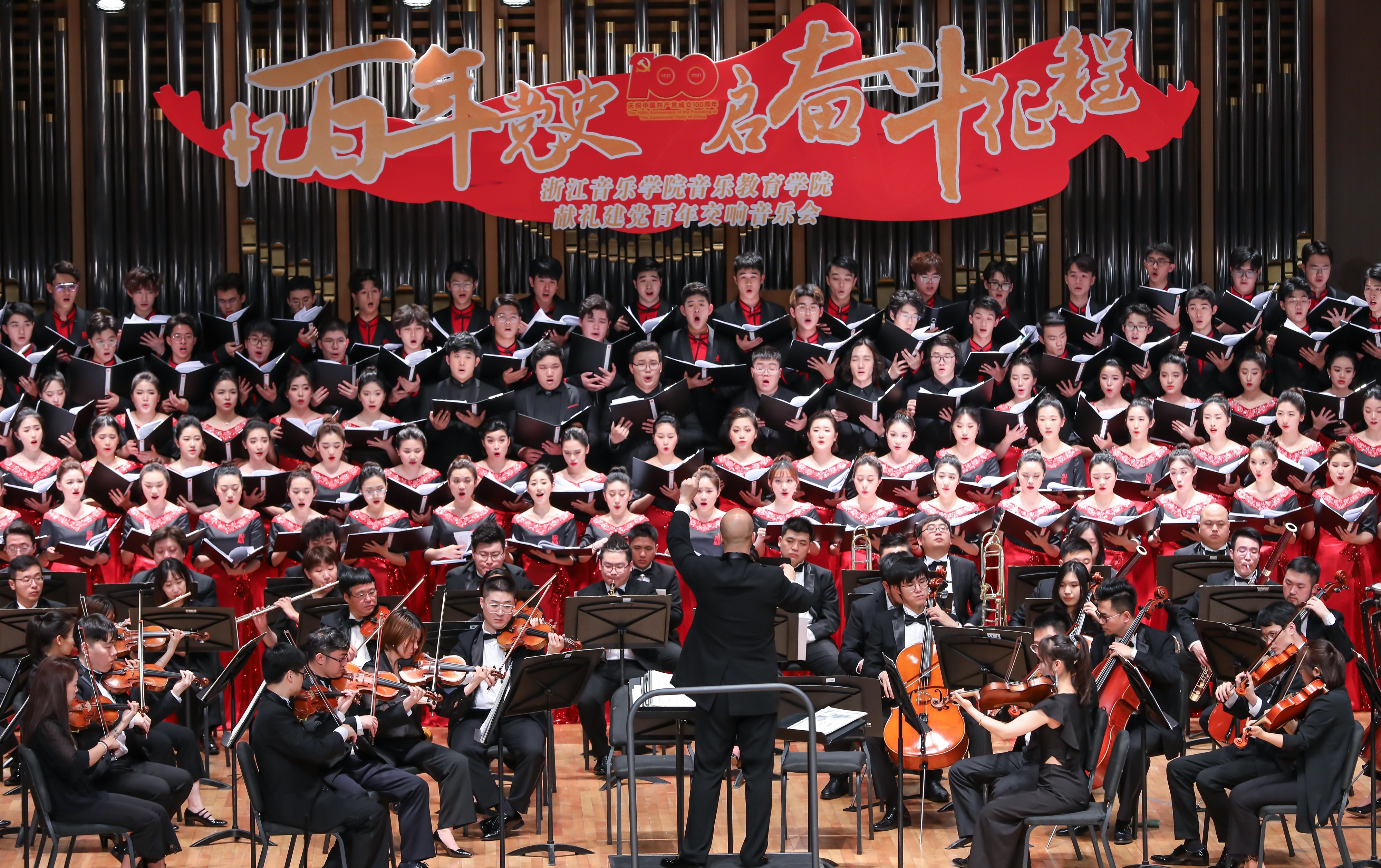 本场音乐会是音乐教育学院党史学习教育的重要活动之一。百余名师生与浙江交响乐团共同演绎了多首展现党和国家在不同发展时期的经典音乐作品,献礼党的百年华诞,歌颂党的丰功伟绩,传承党的红色基因。音乐会由4个篇章组成,第一篇章“烽火岁月”,合唱《过雪山草地》《忆秦娥·娄山关》重温了中国工农红军长征的壮丽史诗和长征精神,男声独唱《延安颂》、钢琴协奏《黄河》、合唱《七律·人民解放军占领南京》致敬以毛泽东同志为代表的老一辈革命家和前仆后继、英勇作战的革命志士。第二篇章“激情年代”,以《祖国颂》《你是这样的人》《唱支山歌给党听》三首合唱歌颂了中国革命的伟大胜利,共同庆祝祖国的辉煌成就。第三篇章“改革征程”,合唱《春天的故事》《在灿烂阳光下》,男声独唱《把一切献给党》,描绘了中国在改革和建设事业上开创新局面,神州大地一派欣欣向荣的美好图景。第四篇章“伟大复兴”,合唱《中国进入新时代》《不忘初心》,女声组唱《我爱你,中国》抒发了师生对中国特色社会主义进入新时代的满腔豪情,以及对党和祖国的深情热爱,学院党员教师金奇原创歌曲《绿水青山》《嘿,中国牛》展现了音教人奋进新时代的使命担当。在合唱与交响的交相辉映中,在感人肺腑的歌声里,师生回顾党领导中国人民革命、建设、改革和发展的辉煌历史,学习革命英雄的精神和品格,汲取奋发力量,共同为推进中国特色社会主义事业、开启新时代实现中华民族伟大复兴中国梦不懈奋斗。