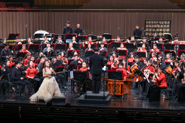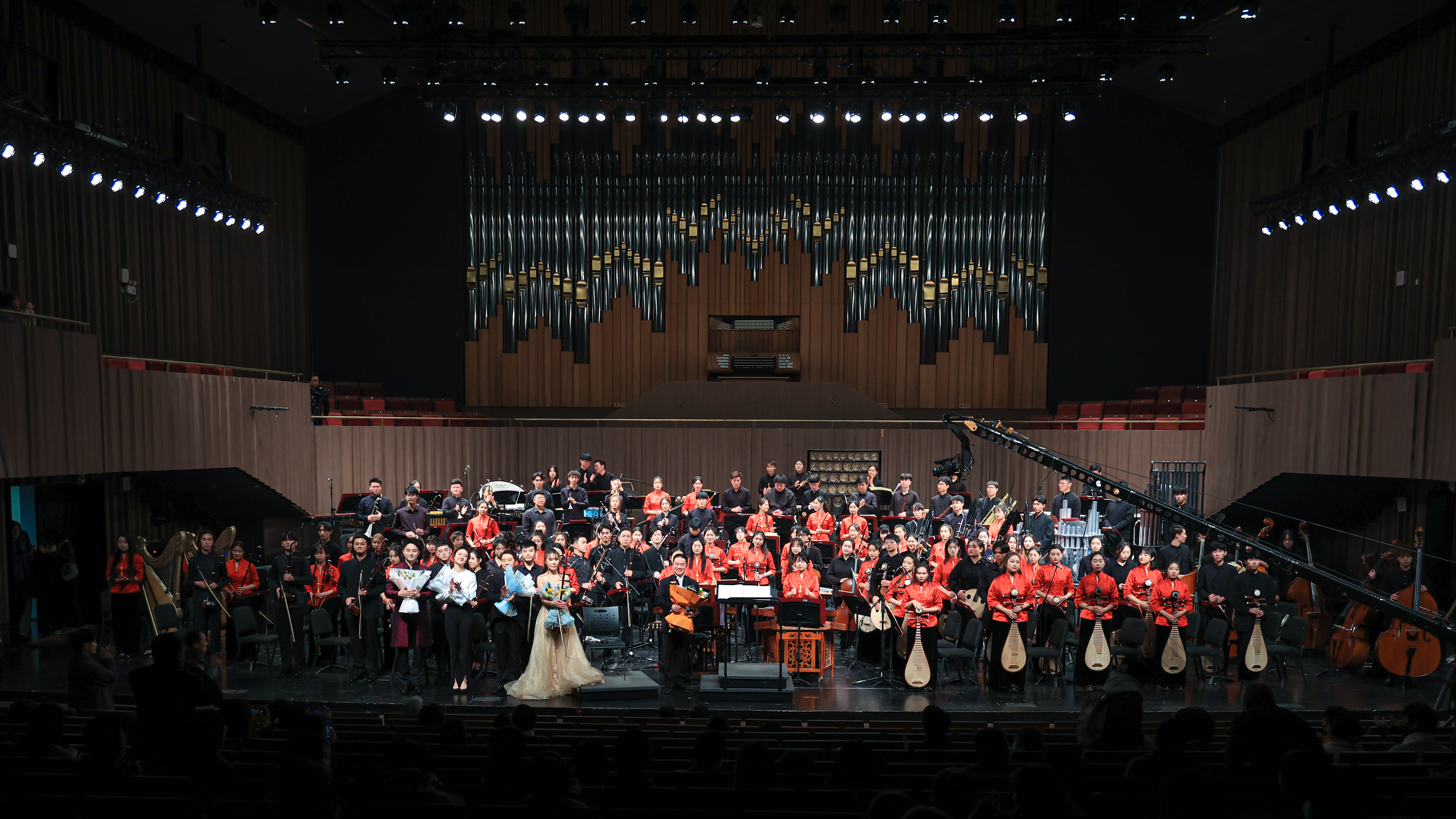 开幕式音乐会带来5首作品,既有民族管弦乐,又有器乐协奏曲,且均为经典之作。第一首作品是郭文景创作的民族管弦乐《阿佤山》,选取了佤族及其他云南少数民族音乐素材,粗犷而不失细腻,带观众走入边陲美景,表现了人与大自然融为一体的永恒力量;第二首是由学院青年作曲家王云飞创作的《英雄壮歌》,磅礴大气、激昂恢弘的旋律让观众感受到中国民族音乐的大气之美;第三首是由国乐系系主任、民族乐队学院艺术总监王甫建教授创作的打击乐与乐队《大河奔流》,用民族管弦乐的声音展示了黄河的奔流,如同中华民族般奋勇前行,生生不息;第四首琵琶协奏曲《草原英雄小姐妹》与第五首二胡协奏曲《长城随想》由国乐系青年教师李跞、孔艳艳分别担任主奏,与青年国乐团共同完成,两首乐曲风格各异,收获了现场观众热烈的掌声。