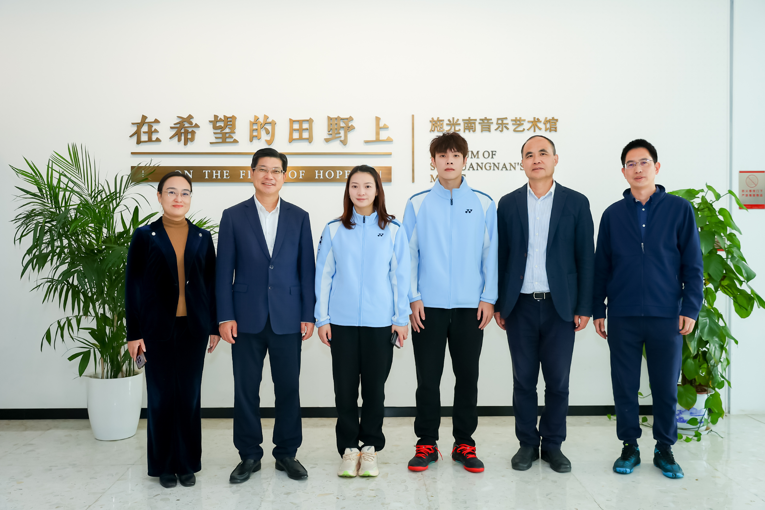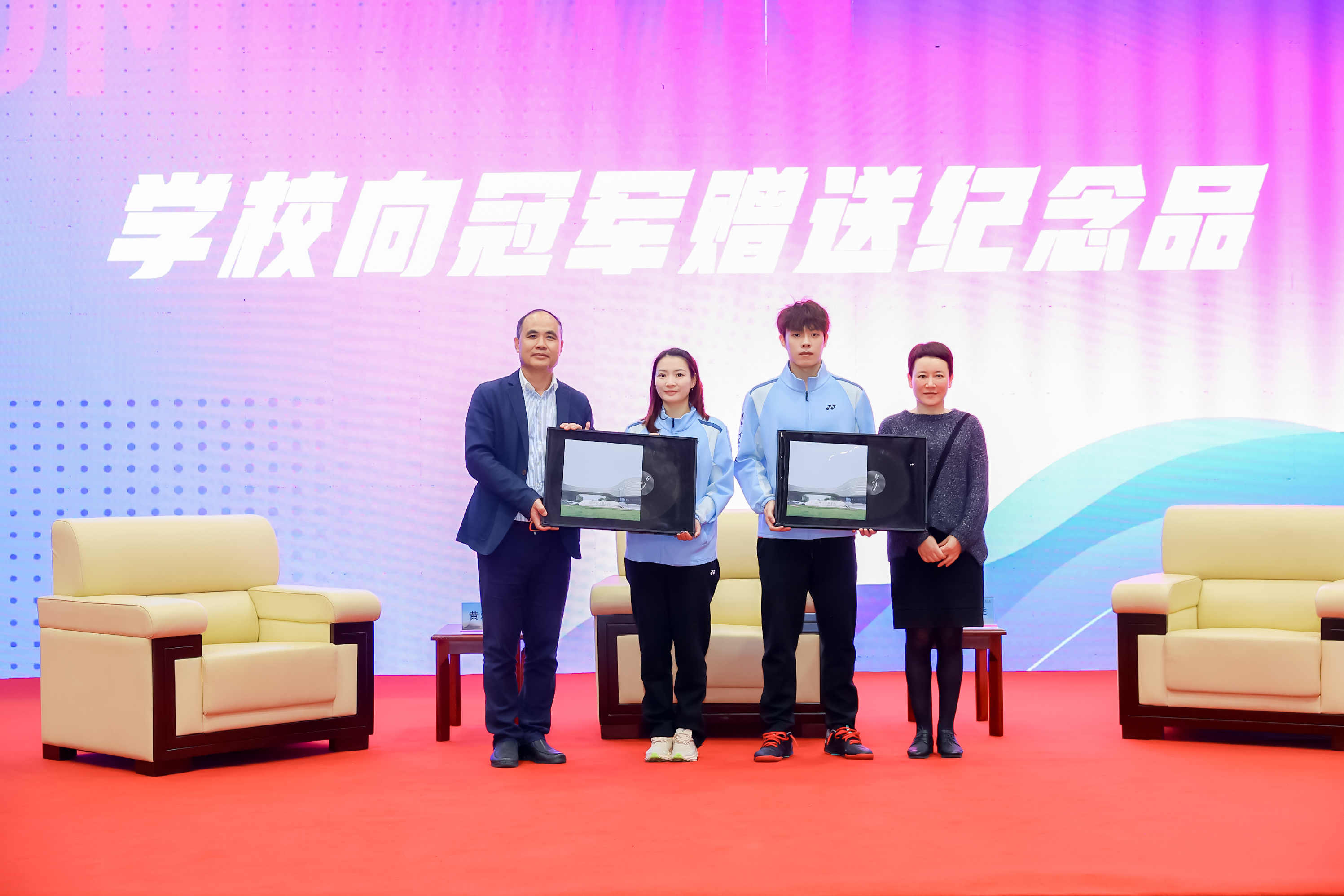 王均寅、奚丽萍向冠军送上纪念品黑胶唱片。冠军回赠签名球拍,并被聘为思政导师。