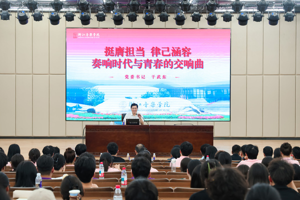 干武东向全体新生提出了四点期望:要坚定理想信念、赓续红色血脉,做胸怀家国的浙音人。青年的命运始终同时代紧密相连。同学们要充分把握好青年时代这一人生价值塑造的黄金期,把握时代脉搏、厚植报国情怀,勇担时代使命,把自己的小我融入祖国的大我、人民的大我之中,与时代同步伐、与人民共命运,才能更好地实现人生价值、升华人生境界。要坚持志存高远、敢于挺膺担当,做勇攀高峰的浙音人。 面对以人工智能为代表的科技革命带来的机遇与挑战,同学们要主动求变,密切关注、实时跟进社会和科技发展前沿,敏于观察、勤于求索、善于思辨,主动学习新技术、新知识,利用数智化工具打破传统音乐、舞蹈学习方式的边界,不断开辟新领域、探索新路径,勇做创新创造的弄潮儿。要坚守高尚品格、甘于脚踏实地,做律己涵容的浙音人。 在疾步前行的当下时代,同学们要守住心性,在大是大非面前要保持清醒头脑,敬畏法律法规、注重品德修养,做到慎独慎微、自律自省,在大学生涯逐步形成清晰的自我认知,脚踏实地,追求更有高度、更有境界、更有品位的人生。要坚信青春无价、提升综合素养,做豁达阳光的浙音人。要珍惜青春,多元发展。要面向社会,“走出网络舒适区”,积极参与实践演出活动,在服务社会中开阔视野、增长才干。要陶冶情操,养成良好的生活习惯,树立积极的生活态度,成为一个身心健康、精神丰富、志趣高雅的人。要学会规划,管理好时间、情绪和人际关系,努力在浙音成长为最好的自己。